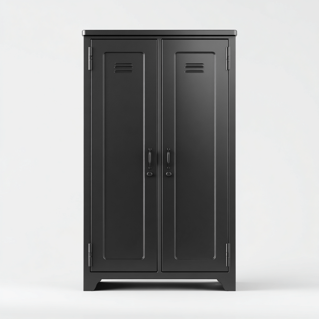 L'armoire est fabriquée en métal avec une finition noire mate, résistante à l'usure quotidienne. Les poignées métalliques assurent une prise en main confortable.