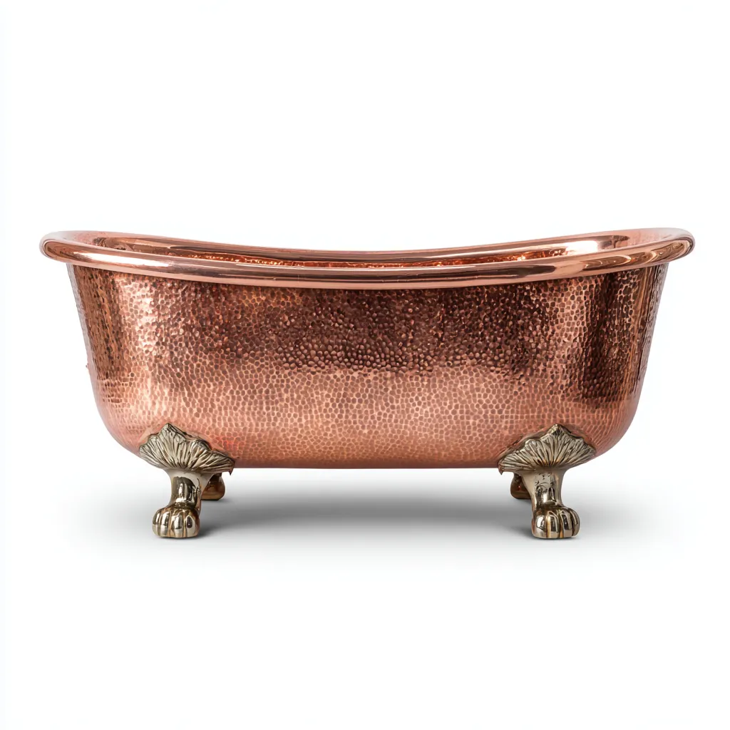 Cette baignoire en métal finition cuivre martelé avec pieds décoratifs présente une esthétique vintage idéale pour créer un espace de bain élégant et original.