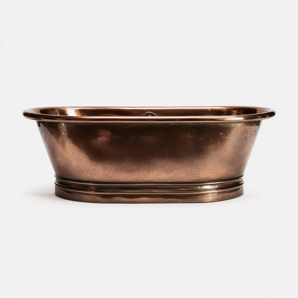 Cette baignoire indépendante en cuivre présente une silhouette élégante et une finition martelée qui apporte une touche chaleureuse et authentique à la salle de bain.