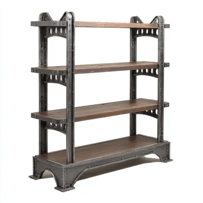La structure est en métal noir finition patinée avec détails rivetés. Les étagères sont en bois brun texturé, offrant un contraste chaleureux et authentique. L'ensemble est robuste et visuellement affirmé.