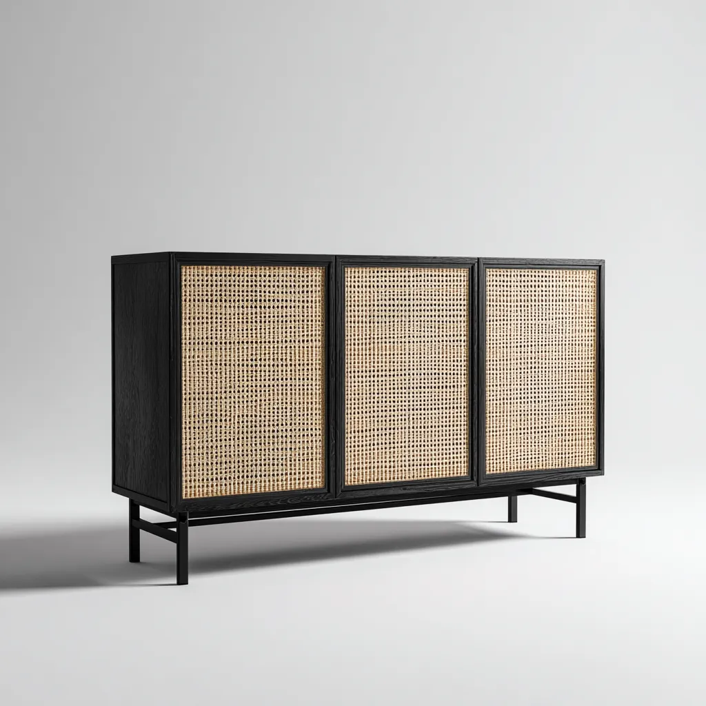 Ce buffet associe une structure en bois noir à des portes en rotin tressé, offrant un équilibre harmonieux entre authenticité naturelle et esthétique contemporaine. Son volume bien proportionné en fait une solution de rangement élégante pour l'espace de vie.