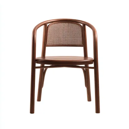 Cette chaise de salle à manger en bois se distingue par son dossier arrondi et son panneau arrière en rotin, offrant une esthétique classique et chaleureuse. Sa silhouette raffinée s'intègre aisément dans les espaces traditionnels ou naturels.