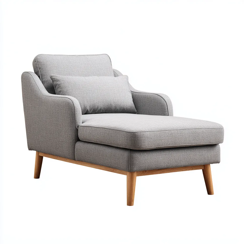 Cette chaise longue au style moderne présente une assise allongée confortable et un revêtement en tissu gris clair offrant une allure élégante et apaisante.