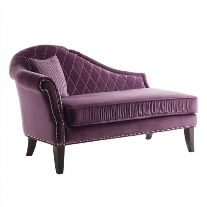 Cette chaise longue en velours violet présente une silhouette classique et des finitions capitonnées créant une assise raffinée adaptée aux intérieurs élégants.