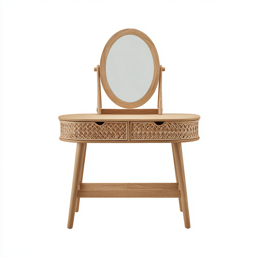 Cette coiffeuse en bois clair adopte une esthétique naturelle avec un miroir ovale orientable et deux tiroirs tressés. Elle est conçue pour offrir un espace pratique et élégant pour les routines quotidiennes de maquillage dans la chambre.
