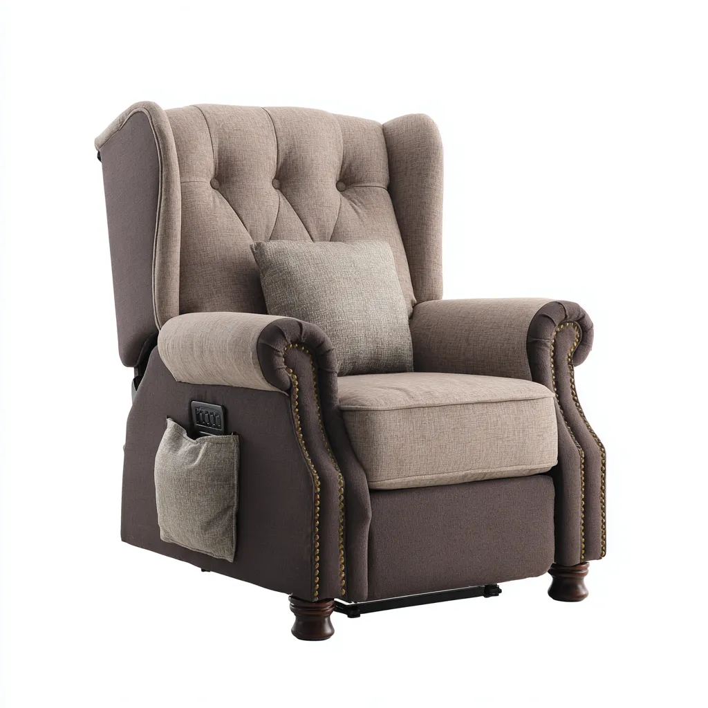 Ce fauteuil relax en tissu bicolore beige et marron est pensé pour offrir une assise stable et confortable au quotidien. Son design classique s'intègre facilement dans un salon, un coin lecture ou un espace détente.