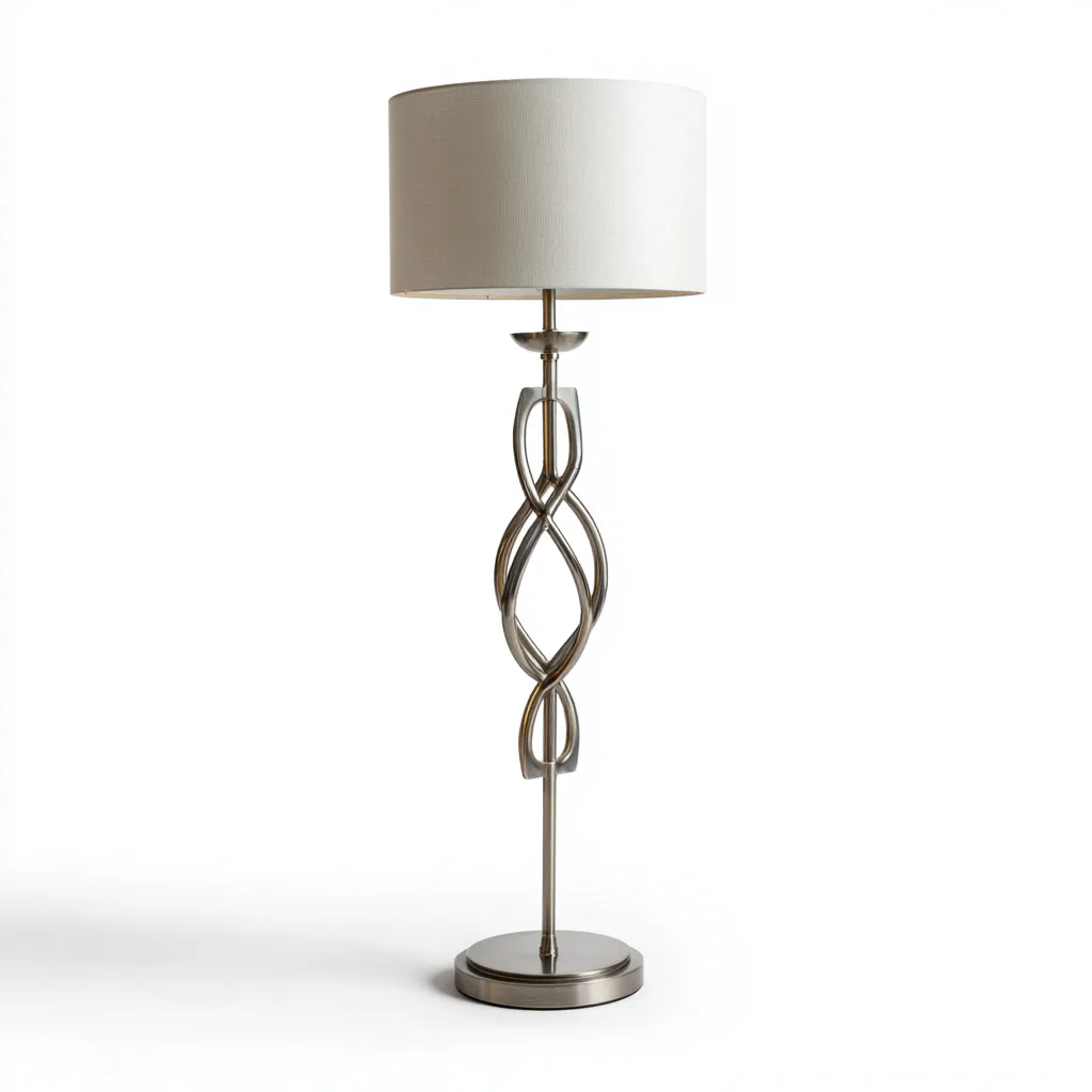 Ce lampadaire se distingue par un pied métallique entrelacé aux courbes élégantes, offrant une présence décorative forte dans un salon, une chambre ou un espace de lecture. Son abat-jour cylindrique en tissu beige diffuse une lumière douce et agréable.