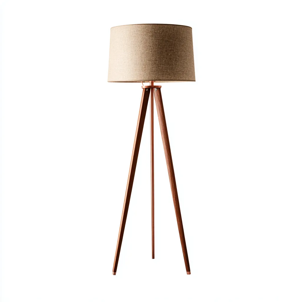 Ce lampadaire trépied se distingue par sa structure en bois teinté cuivre et son abat-jour en tissu beige qui diffuse une lumière douce. Il constitue un choix élégant pour le salon, la chambre ou un coin lecture.