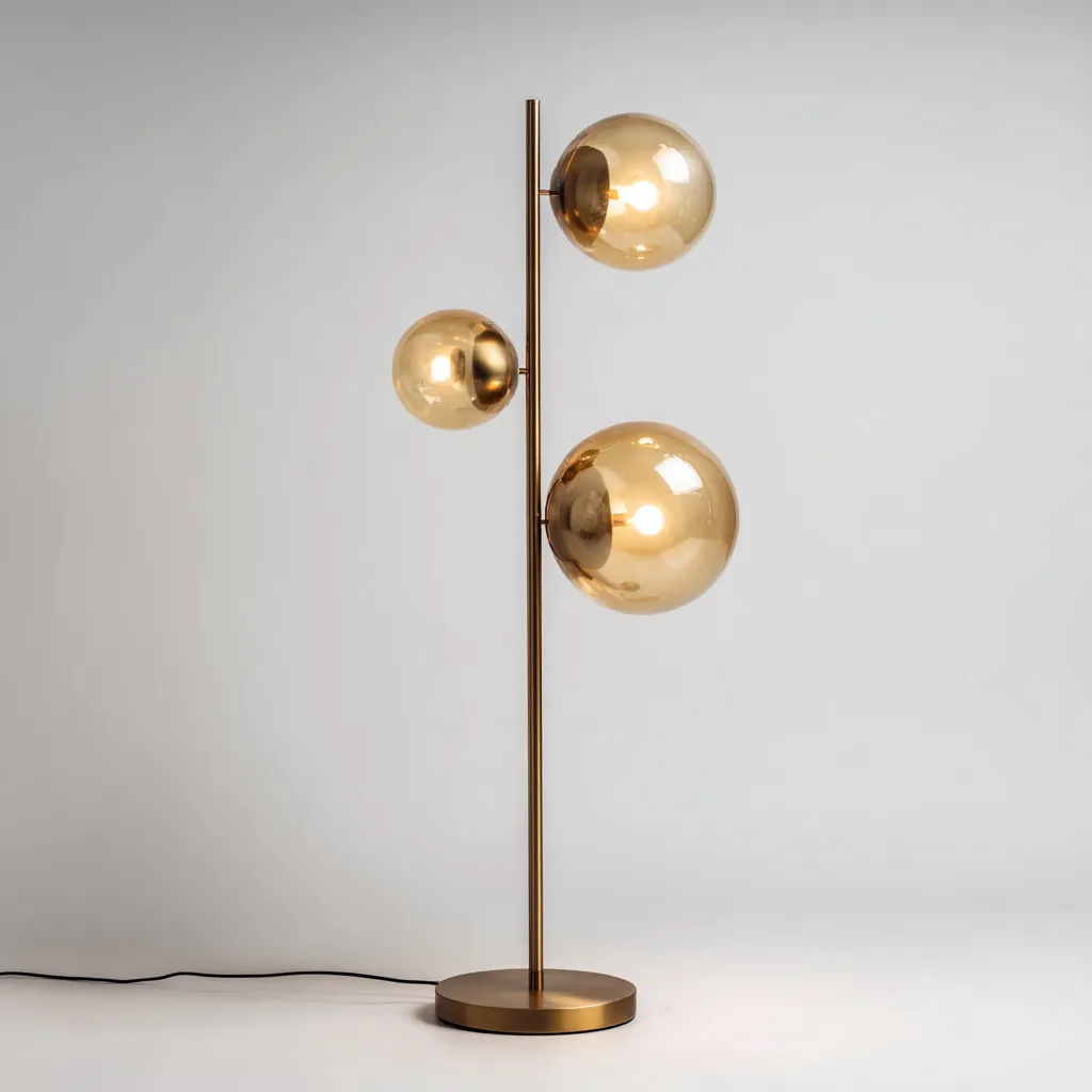La composition à trois globes crée un éclairage multidirectionnel, idéal pour illuminer un salon ou un coin lecture. Son design équilibré allie stabilité, style et fonctionnalité.