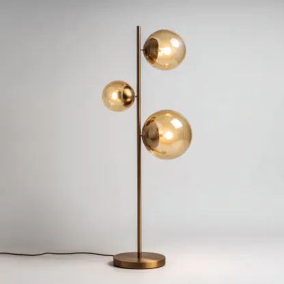 Ce lampadaire moderne se distingue par ses trois globes en verre ambré disposés à différentes hauteurs, offrant une esthétique contemporaine et élégante. Sa structure en métal doré apporte une touche chaleureuse et raffinée à tout espace de vie.