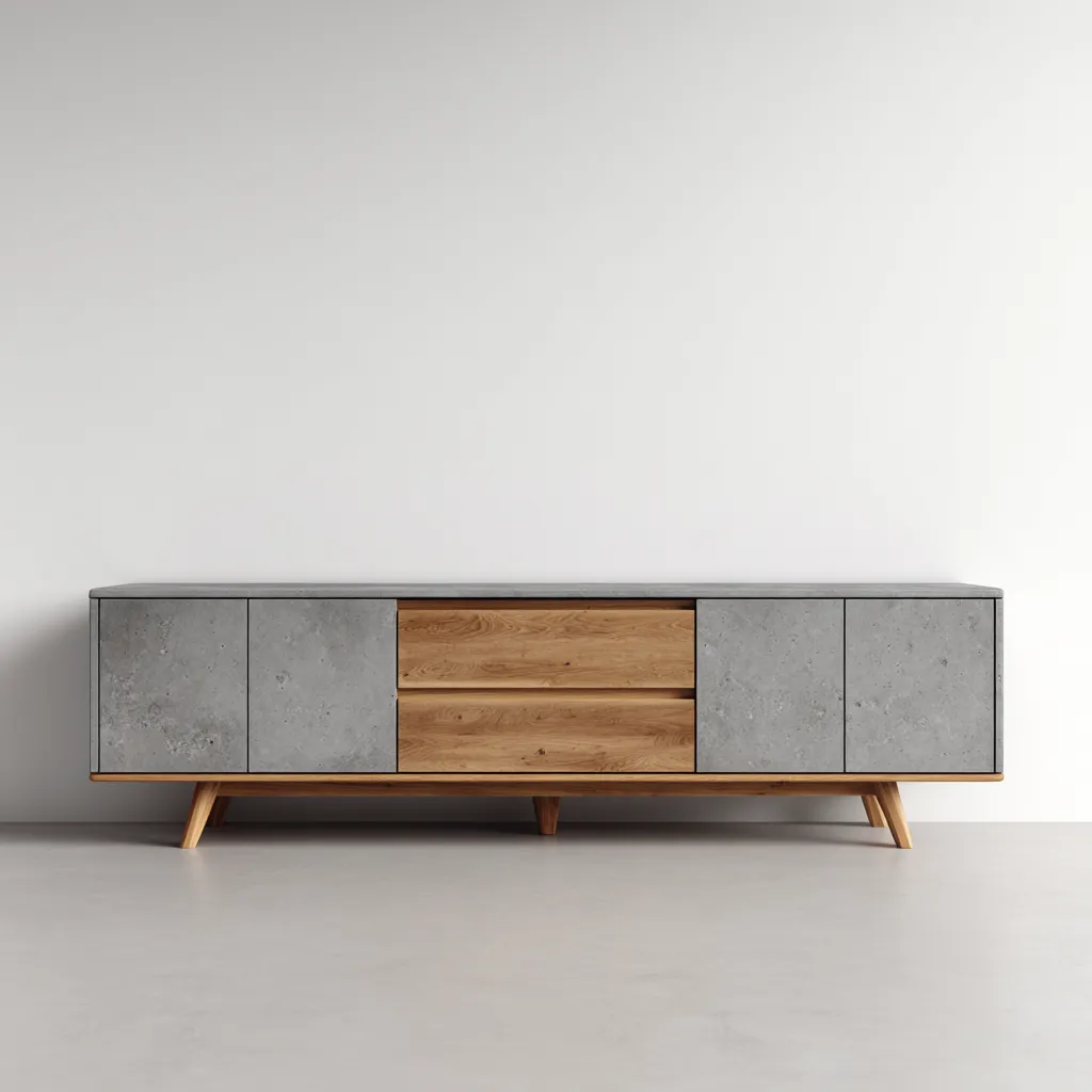 Ce meuble TV au style moderne associe une finition gris effet béton et des éléments en bois naturel pour créer un meuble élégant et structurant, idéal pour aménager un salon contemporain.