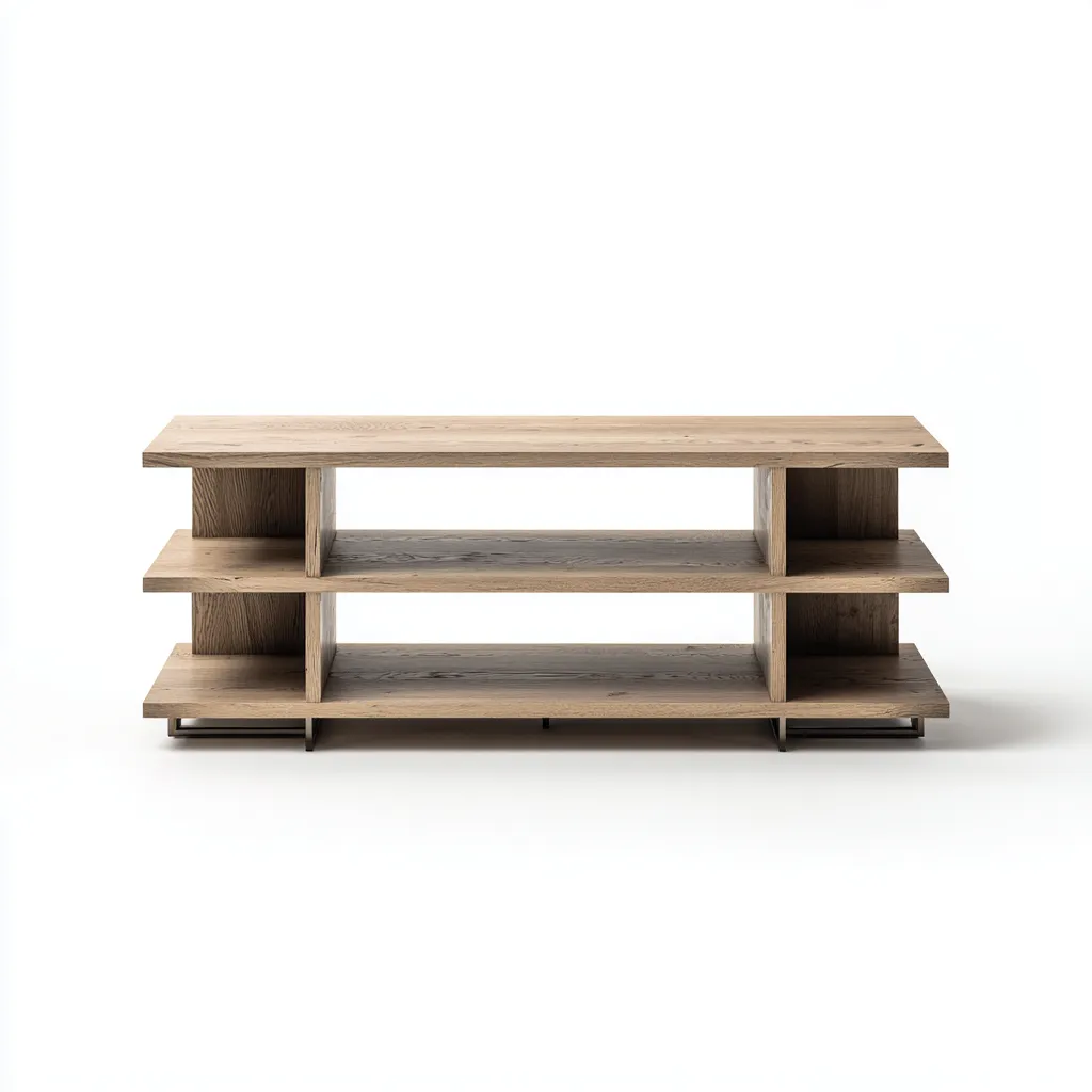 Ce meuble TV en bois au design moderne se caractérise par une structure ouverte et des lignes horizontales équilibrées. Il est conçu pour organiser l'espace salon de façon fonctionnelle tout en conservant une esthétique épurée.
