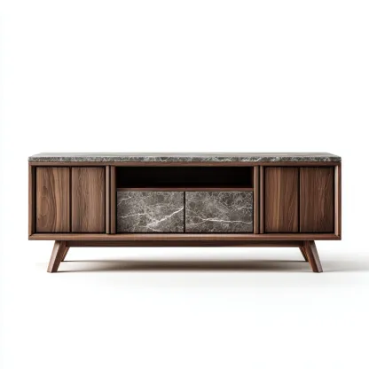 Ce meuble TV au design moderne est conçu pour aménager un espace salon élégant et fonctionnel. Sa silhouette basse et équilibrée permet d'accueillir les équipements audiovisuels tout en s'intégrant harmonieusement dans un intérieur contemporain.