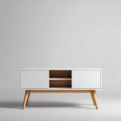 Ce meuble TV au design moderne est conçu pour aménager un salon lumineux et fonctionnel. Sa forme basse et équilibrée permet d'installer un téléviseur tout en conservant une esthétique sobre et harmonieuse, adaptée aux intérieurs contemporains.