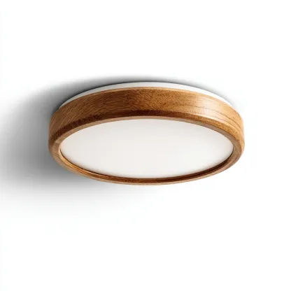 Le contour du luminaire est réalisé en bois naturel, offrant une texture authentique et élégante. Le diffuseur blanc en acrylique assure une diffusion lumineuse uniforme et non éblouissante.