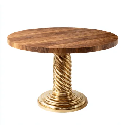 Cette table à manger ronde associe un plateau en bois raffiné et un pied central doré sculpté avec soin. Son allure élégante en fait un élément décoratif fort tout en offrant une surface confortable pour les repas quotidiens.